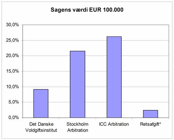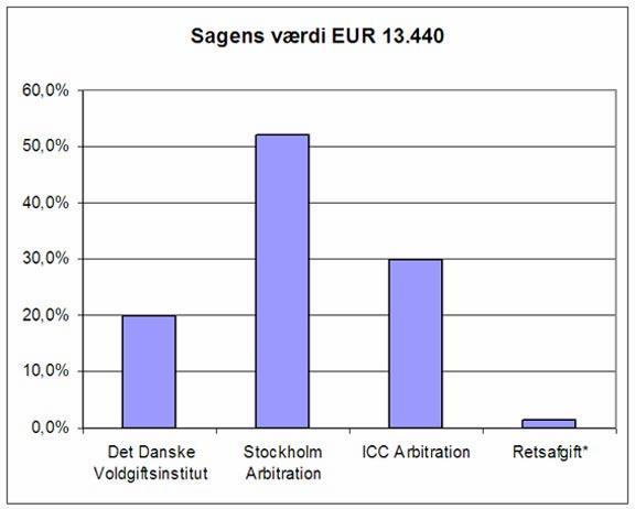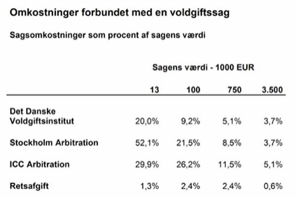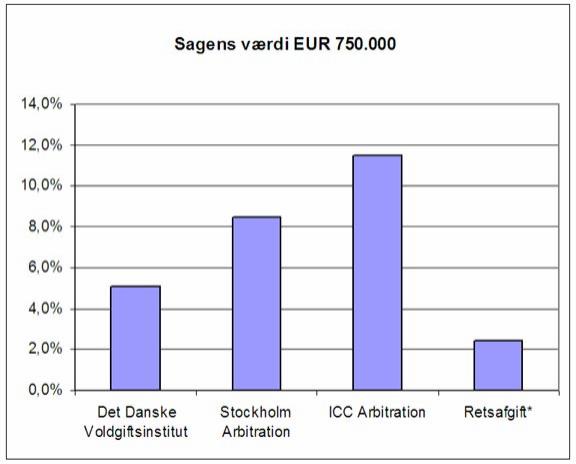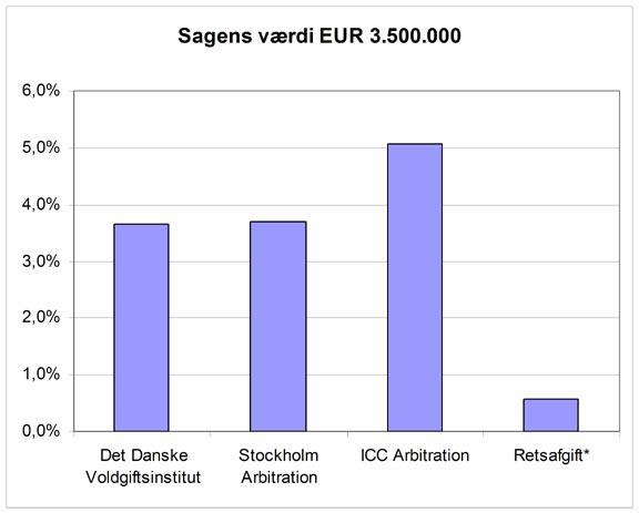 Det kan være interessant at sammenholde procentsatserne med sagen U2004.1179V, som var en ad-hoc voldgiftssag med en sagsgenstand på 3,7 mio. USD. Voldgiftsretten, der bestod af tre dommere, fastsatte sit honorar til 214.000 USD, og denne honorarfastsættelse blev indbragt for landsretten i medfør af voldgiftslovens § 6 med påstand om nedsættelse med 50 %, subsidiært en mindre del efter landsrettens skøn. Honoraret i den sag udgjorde 5,8% af sagsværdien (ad hoc sag, så ingen administrativ afgift) og landsretten mente ikke der var grundlag for at tilsidesætte honoraret som urimeligt. Det skal erindres at tallene nedenfor bygger på middelværdier og ikke tager højde for sagens kompleksistet, omfang og det tidsmæssige forbrug.